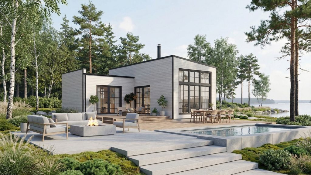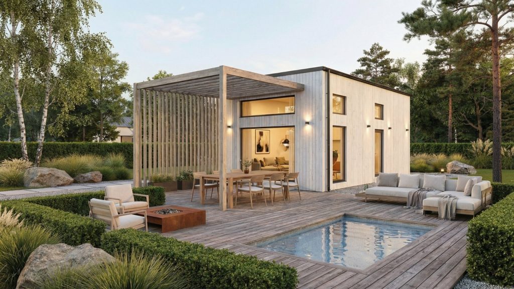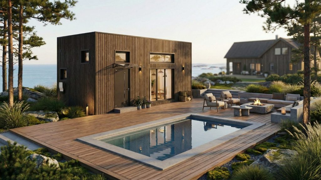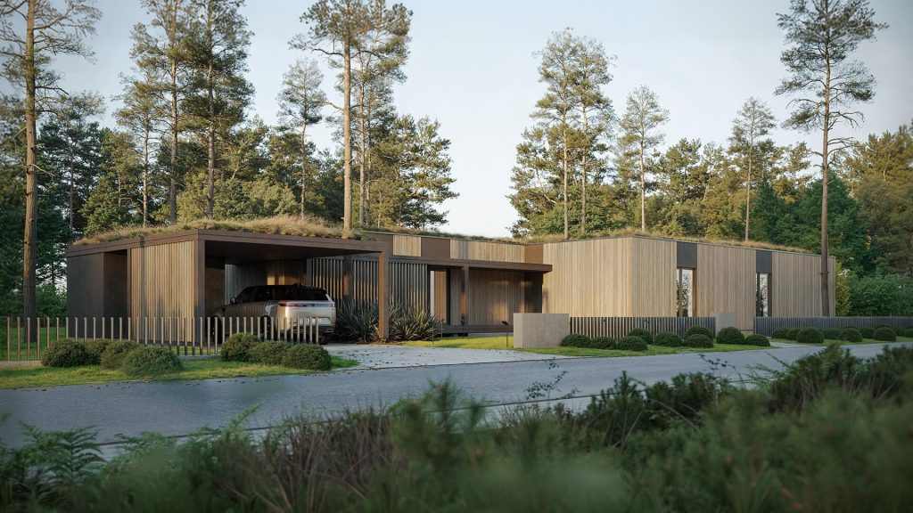 Arkitektritade ekologiska hus med naturlig design, minimalt fotavtryck. Naturlig skönhet, hållbara hem.