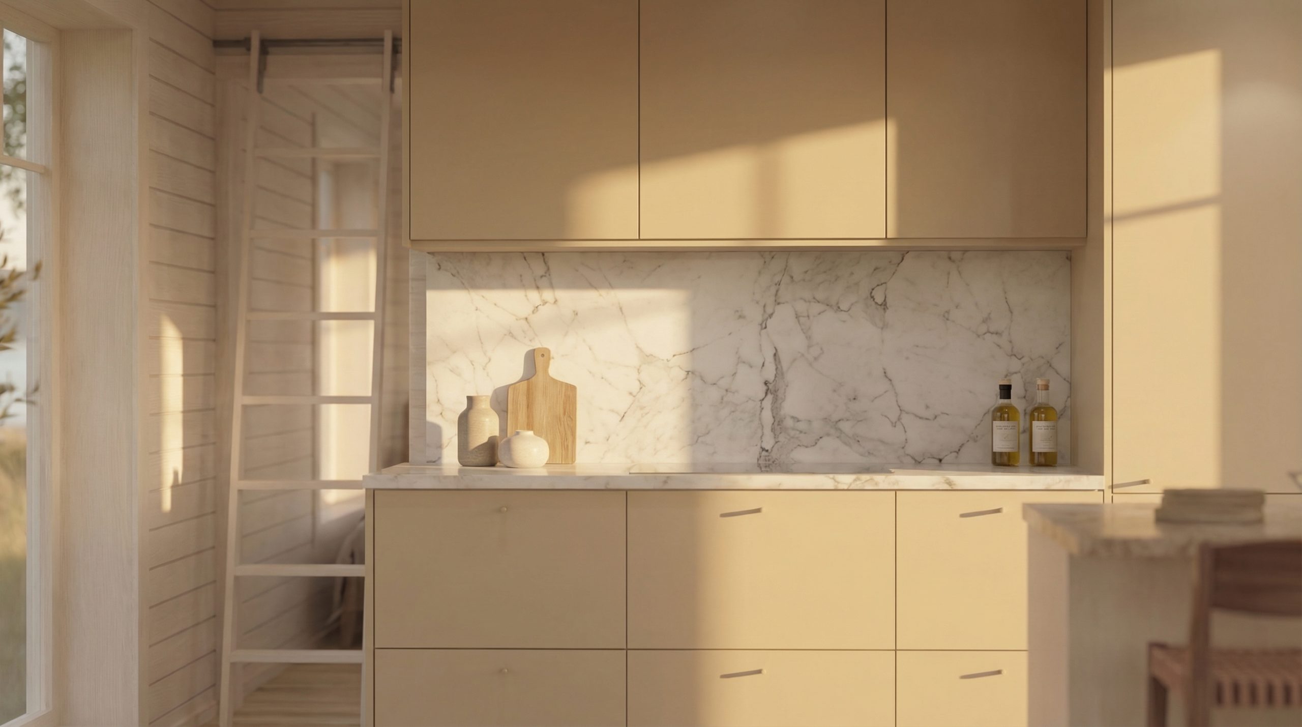 Köket är nätt men fullt fungerande med plats för både spis, diskho och förvaring. Separat kyl och frys i halvformat är integrerade i en köksö som kan fungera som både matbord och arbetsbänk. Över badrummet och spisen finner du sovloftet som bildar ett mysigt krypin.