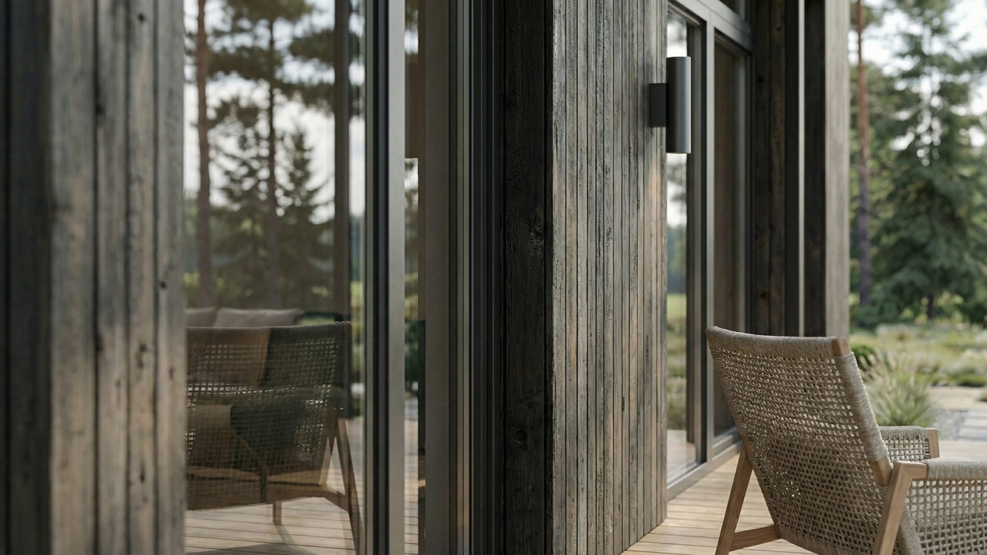 Stenliknande panel pryder stora delar av Theos fasad och skapar en unik och rustik känsla som spelar fint mot den stående träpanelen. Den minimala taklutningen ger huset ett modernt utseende och maximerar den invändiga volymen.